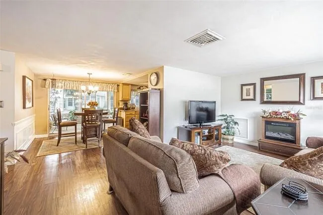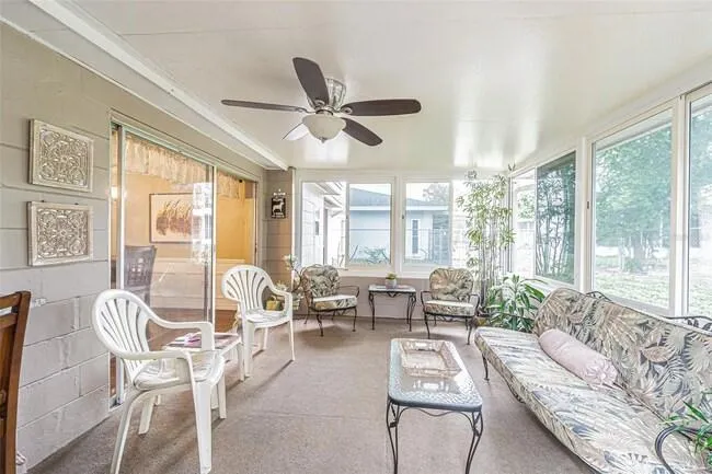Move-in ready 2BR/2BA with a bright, open layout. Updated kitchen with stainless appliances and quality cabinetry; modern, refreshed baths. The star is an oversized four-seasons room wrapped in windows—great for year-round lounging or hosting. Outside, a fenced backyard with brick pavers makes entertaining easy. Comfortable, low-maintenance living throughout.