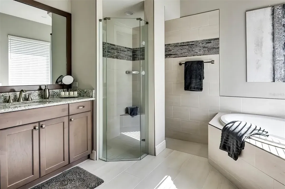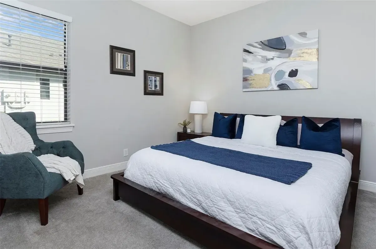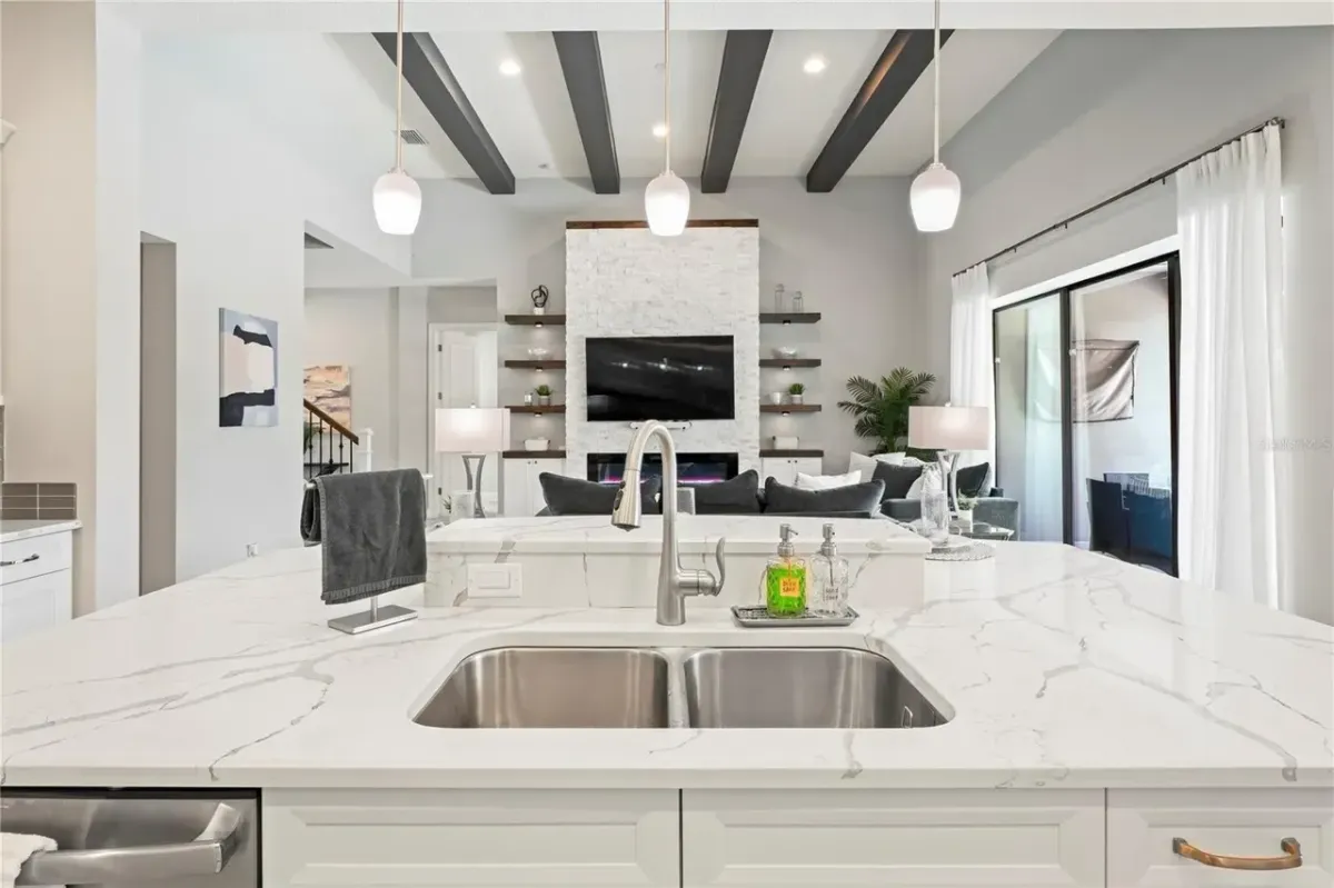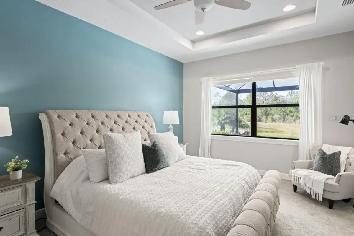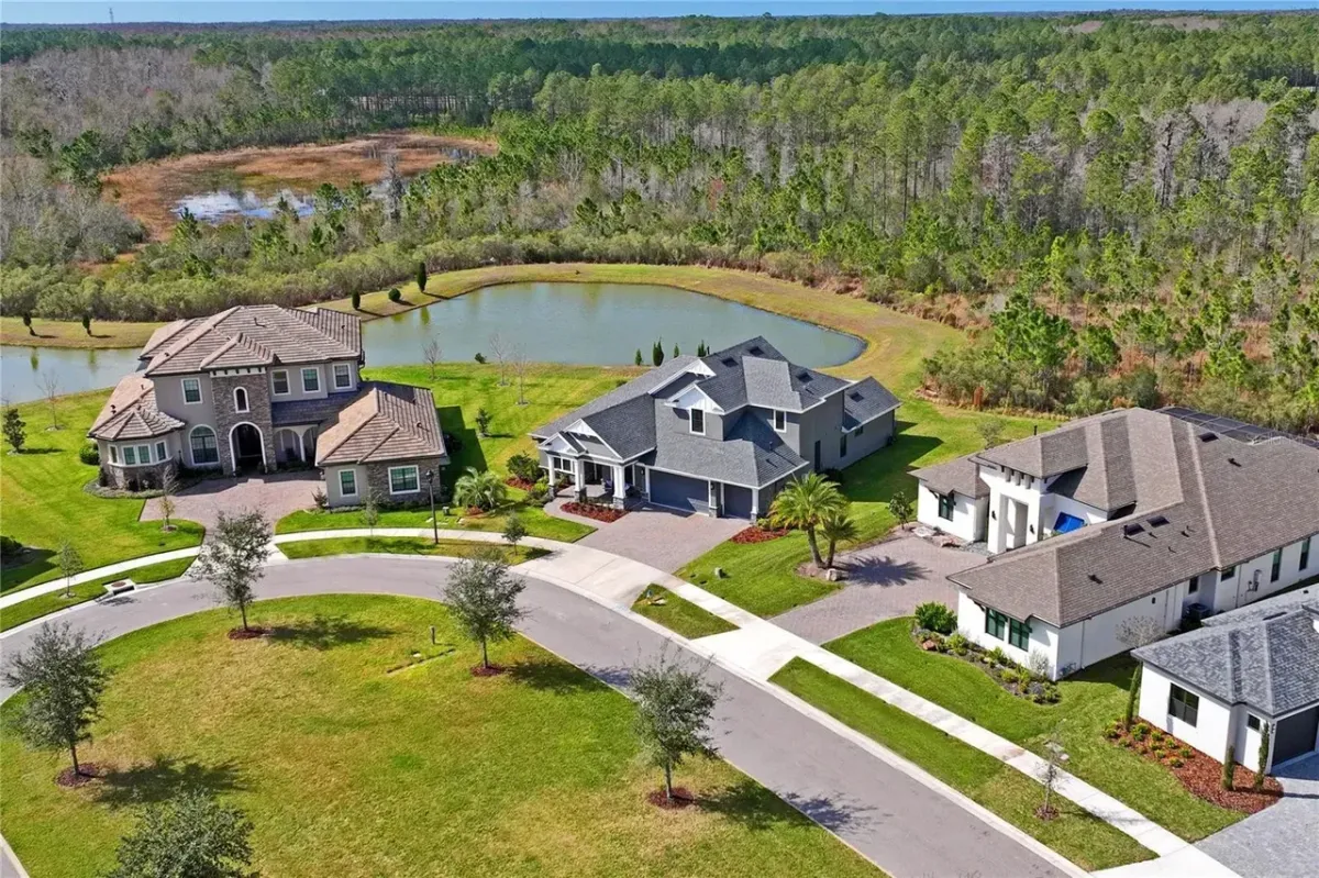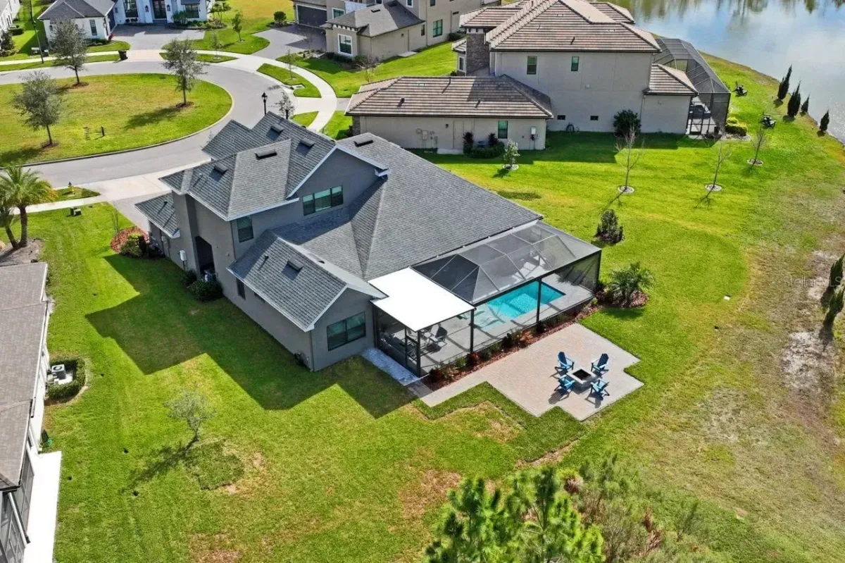 Seller offers $10,000 to help buy down your rate. Set on a quiet cul-de-sac, this Arthur Rutenberg showpiece sits on a .35-acre waterfront lot with sunset views, low HOA, and no flood insurance required. Inside, 15' ceilings and a floor-to-ceiling fireplace anchor the open great room, with stacking sliders to the lanai. The main level features a chef’s kitchen with butler pantry, dining and living areas, two private offices, full laundry with cabinets/sink, and an owner’s suite with dual custom walk-in closets and spa bath. Upstairs are two more bedrooms, a bath, and a flexible bonus room—perfect for a theater or game space. Outdoor living shines with a pool, waterside fire pit, and summer kitchen (grill + granite). Practical perks include a 3-car garage, dual HVAC, whole-house surge protection, water softener/filtration, security cameras, and whole-home network wiring. About 21 miles to TPA; enjoy Bexley’s clubhouse/café, trails, dog park, sports fields, seven parks, game room, and two resort-style pools.
